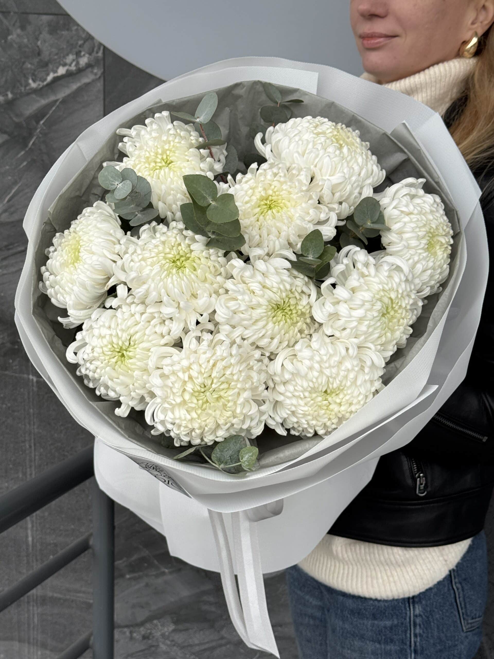 11 snow-white chrysanthemum balls and 2 sprigs of eucliptus