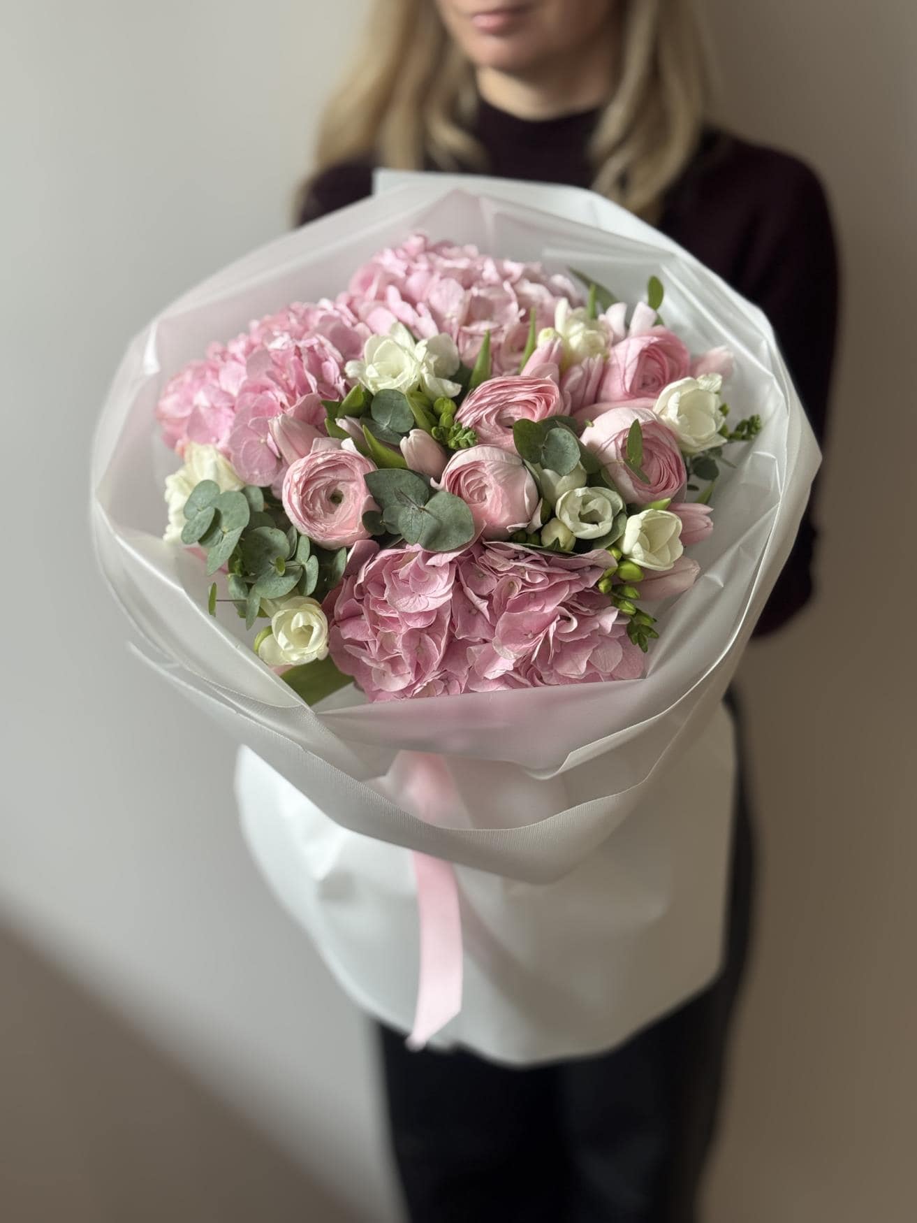 Flower shop Studio Flores offers the best Exclusive bouquets of flowers with delivery in Kyiv. You can buy Bouquet flowers with hydrangea and ranunculus Alika for 4780 UAH. Our flower shop offers free delivery of bouquets in Kyiv from 1500 UAH.
