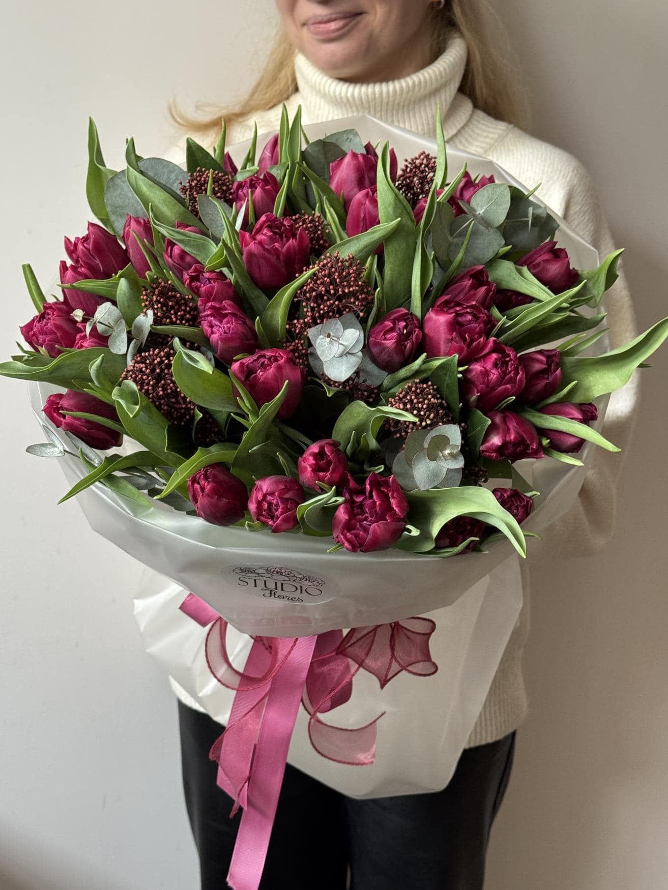 Flower shop Studio Flores offers the best 35 Tulips with delivery in Kyiv. You can buy Bouquet of 35 peony tulips with a garland for 4290 UAH. Our flower shop offers free delivery of bouquets in Kyiv from 1500 UAH.