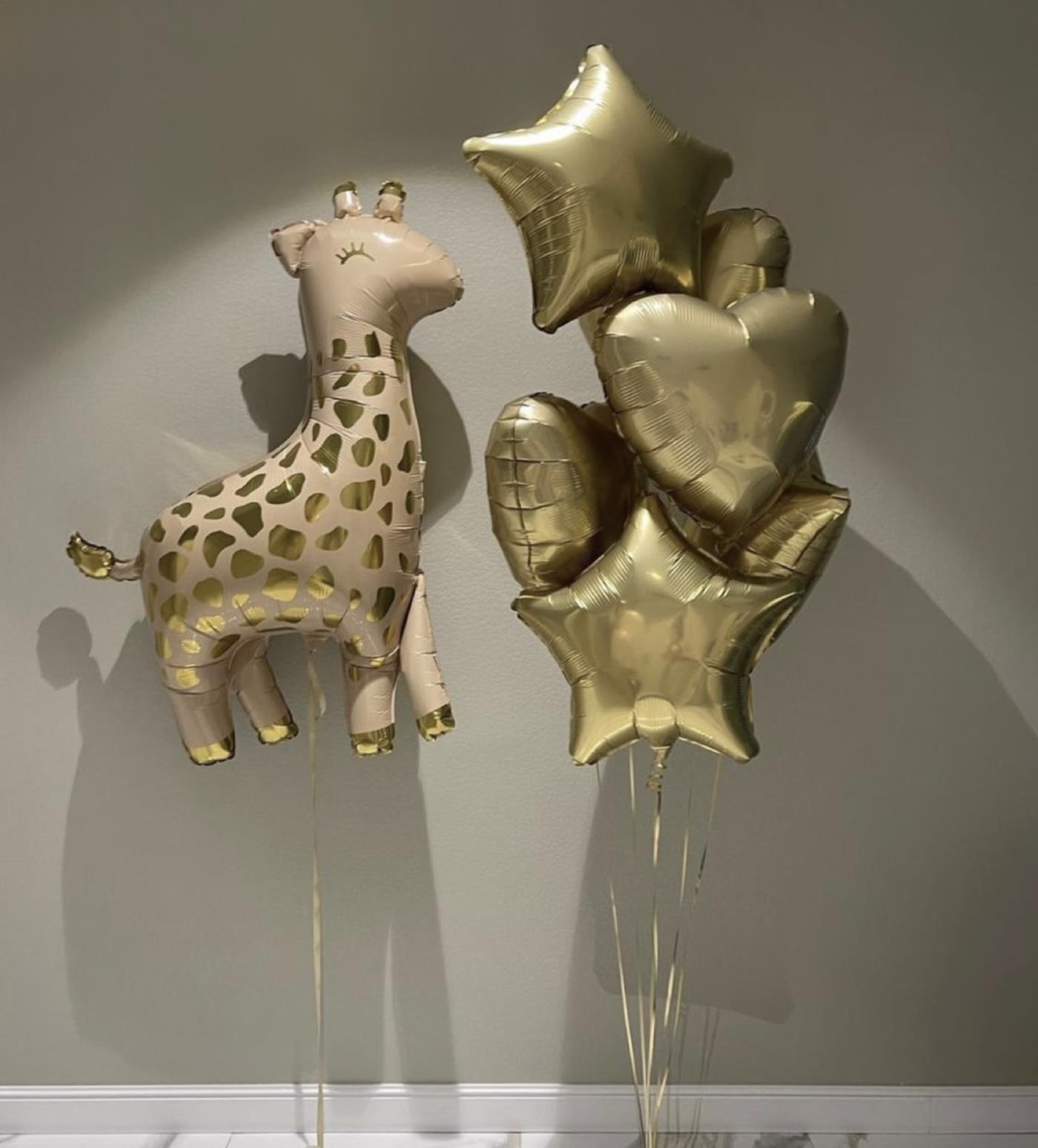 A giraffe-shaped plastic balloon with 7 gold foil stars and hearts. A perfect gift for a child or adult.
