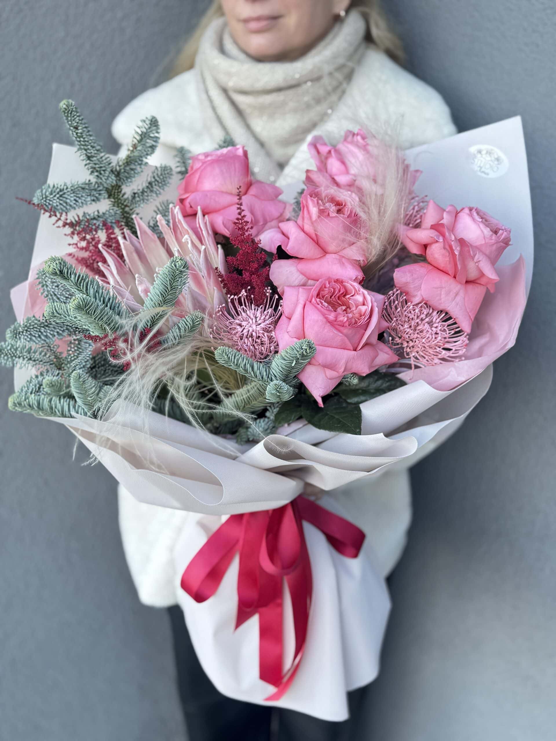Very simple to order Roses Lemonade. Shop online flores-shop.com.ua can create elegant bouquets of hyacinth for the occasion or just like that. Chapter Bouquet with protea will exceed all expectations regular customers. Reasonable prices for Gift "Sweet bunny in flowers", Helium balloon Zebra, Bride's bouquet 12 will allow to take easy and inexpensive. Fast sending Obolon and to other districts of Kiev. Skillful florists STUDIO Flores at an affordable price will embody any of your floral ideas. Winter bouquet with spruce, protea, and roses — spectacular compositions at attractive prices.
