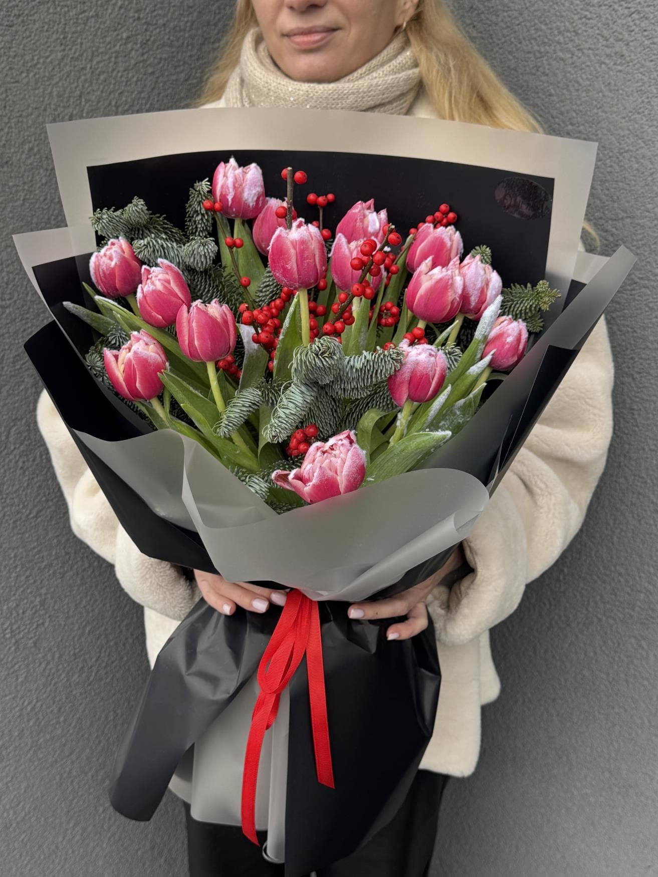 Flower shop Studio Flores offers the best Tulips bouqets with delivery in Kyiv. You can buy Winter Tulip Bouquet with Ilex for 2950 UAH. Our flower shop offers free delivery of bouquets in Kyiv from 1500 UAH.