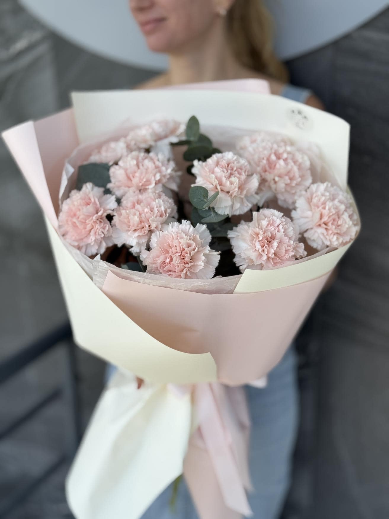 Букет из 11 веток нежно-розовых гвоздик сорта Эпл Ти и веточка эвкалипта. Прекрасный, недорогой вариант, если хочешь чтобы твой букет простоял больше недели.