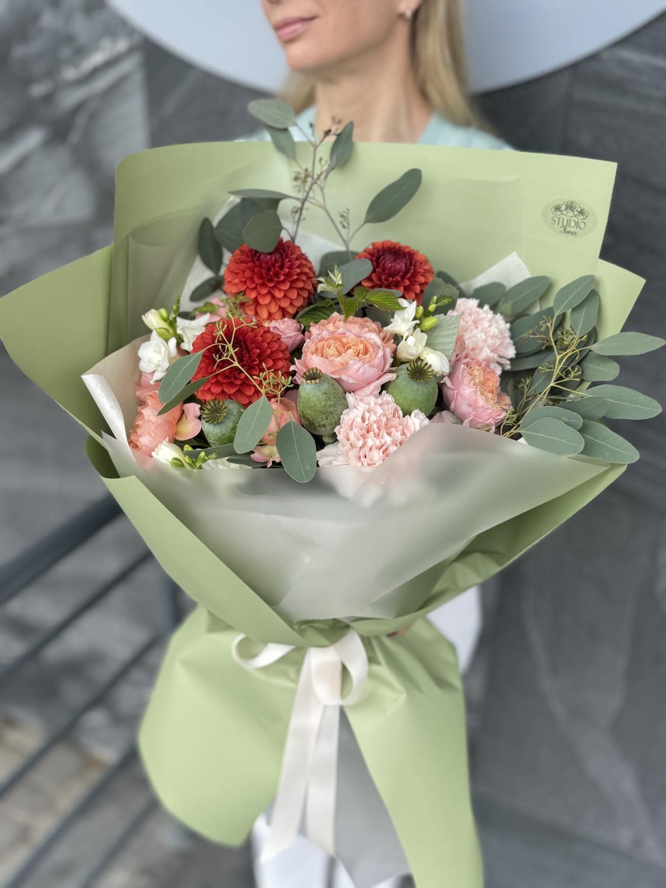 3 веточки малины, 3 фрезии, 3 георгины, эвкалипт, 2 нвоздики, 2 веточки кустовой розы Джульетта, 3 папавера.