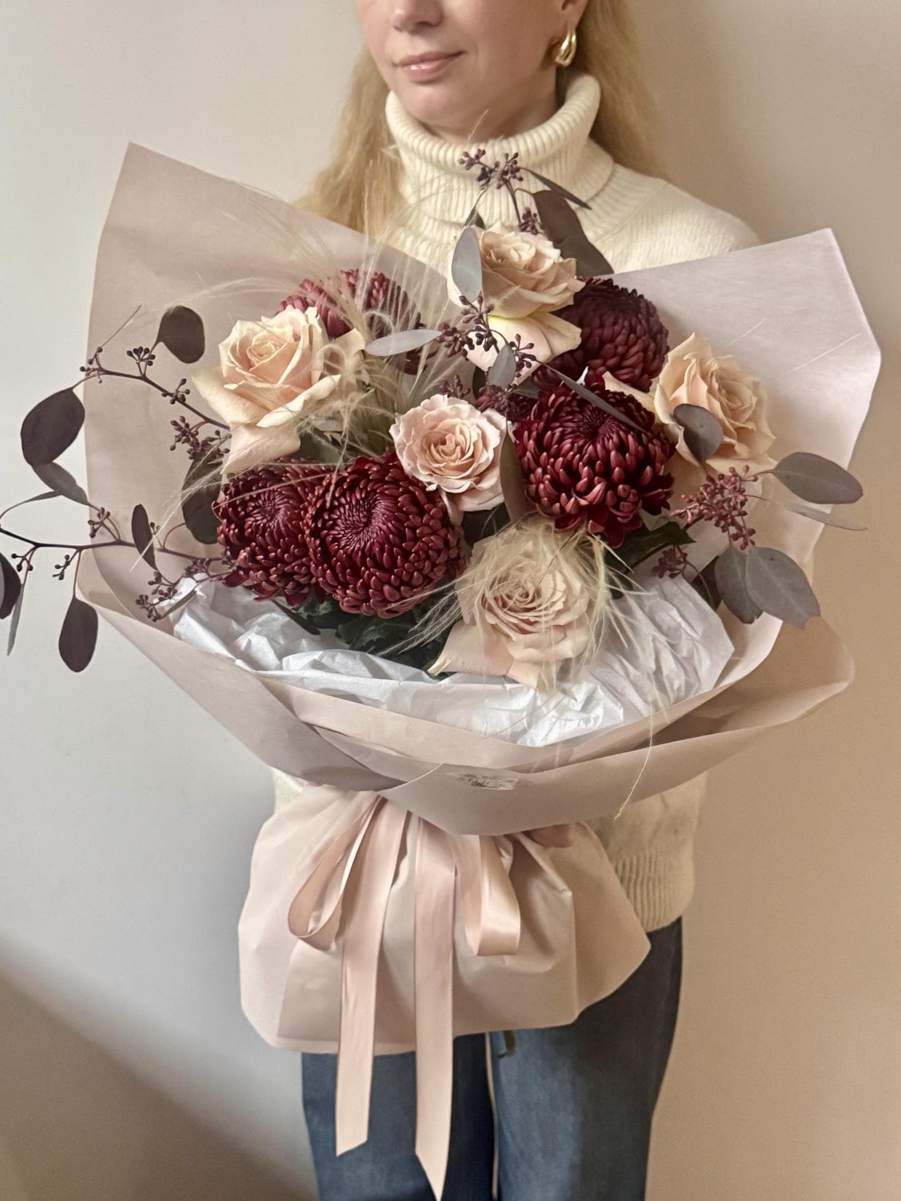 2. Выбирайте композиции с цветами классической формы или необычными сортами хризантем. Мы оформляем букеты с применением фирменной бумаги, шляпных коробок, корзин.