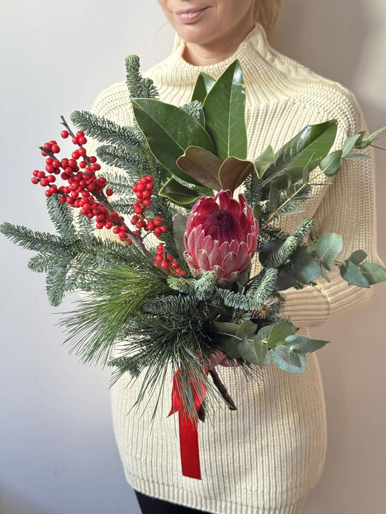 Харизматичный, стильный зимний букет с протеей, который будет долго радовать вашего получателя.