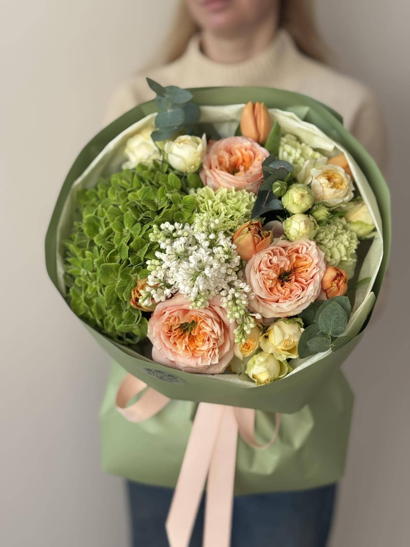 Гортензия, 3 пионовидных розы, 3 гвоздики, эвкалипт, 3 веточки кустовой пионовидной розы подобранной в тон, 5 пионовидных тюльпанов и веточка сирени.