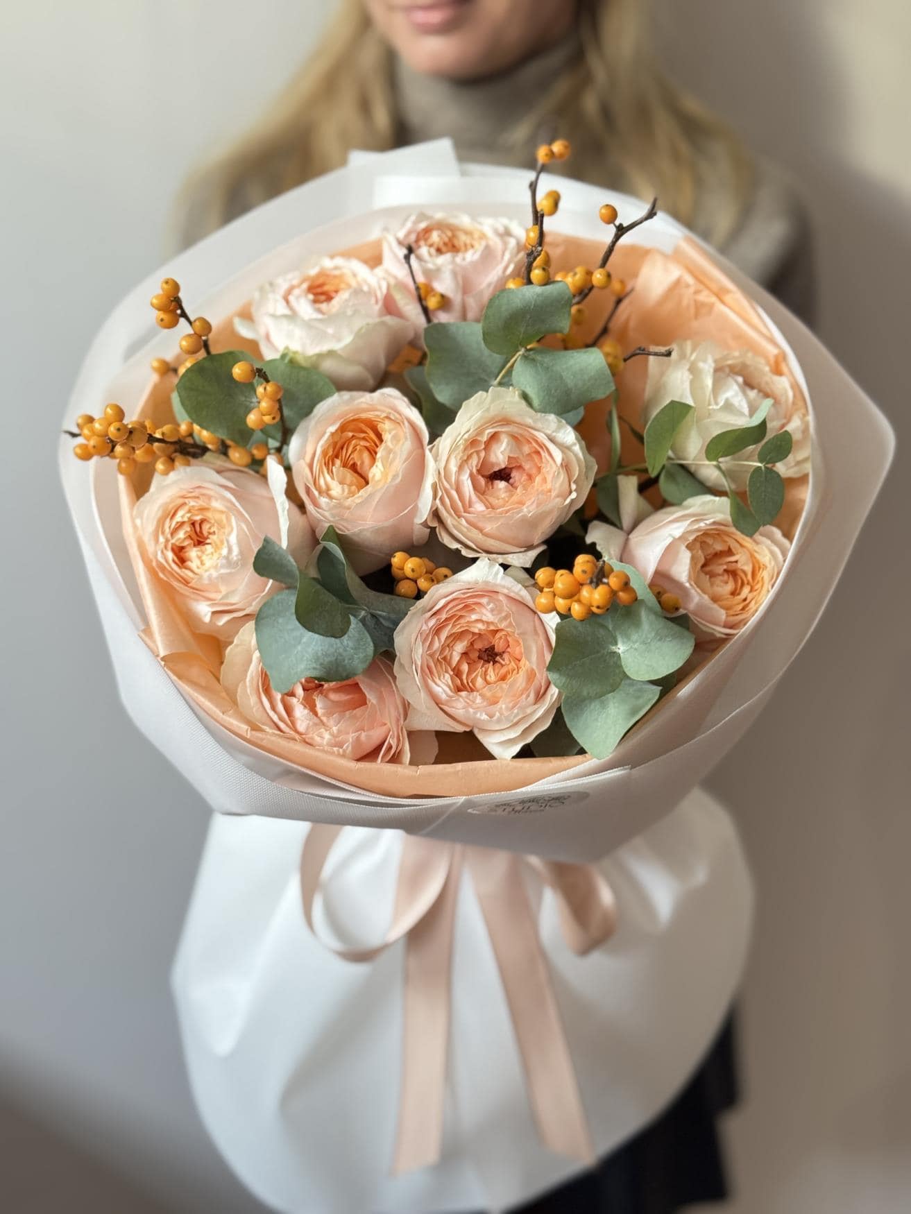 9 піоноподібних троянд Девіда Остіна Джульєтта, 3 гілочки ягід ілексу, евкаліпт.