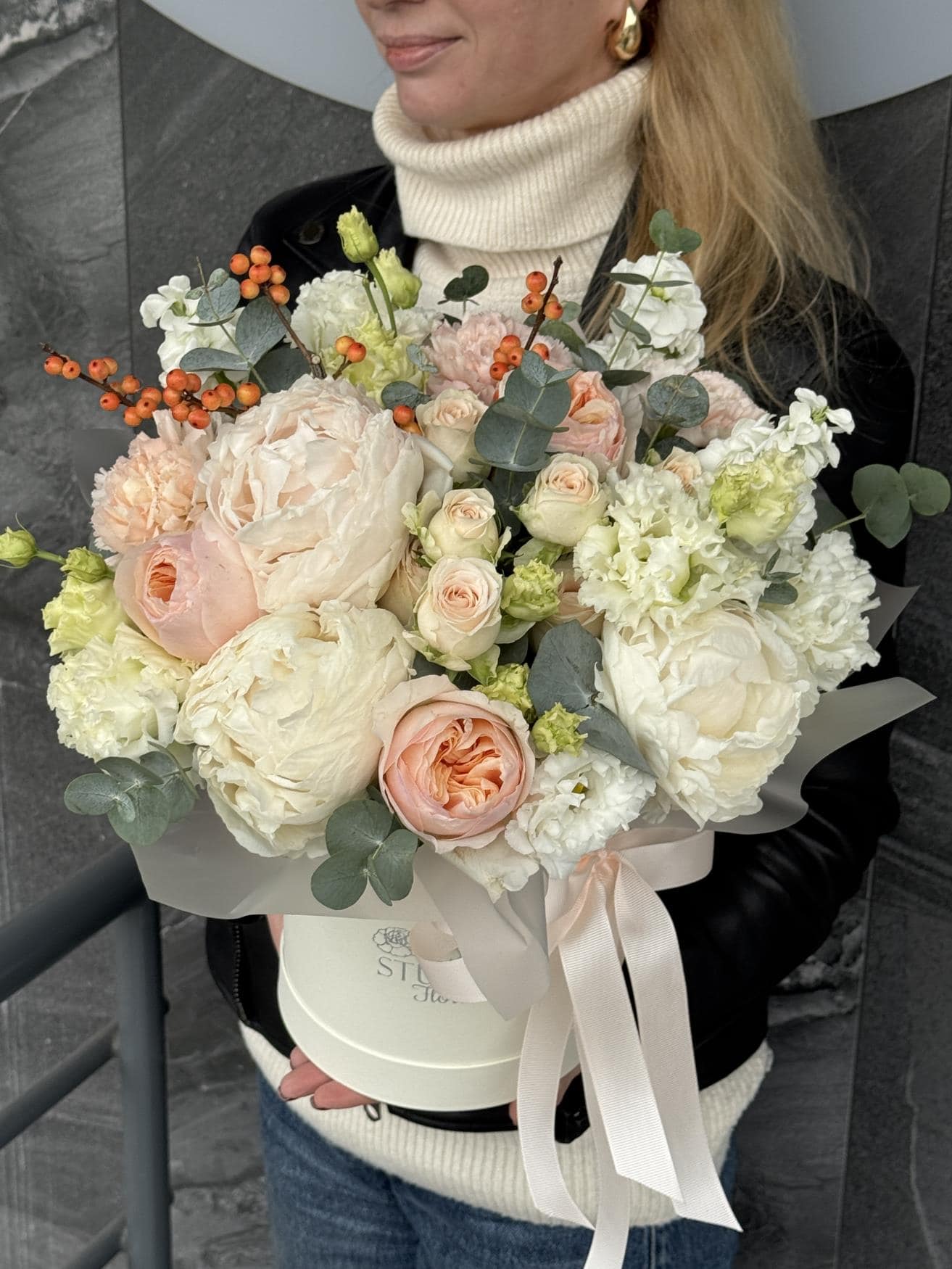3 півонії, 3 піоноподібні троянди Девіда Остіна, гілочка кущової троянди, 2 еустоми, 3 матіоли, гілочка ілексу, 3 гвоздики та евкаліпт.