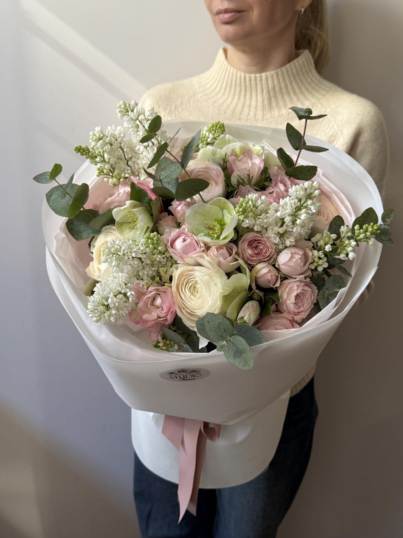 3 гілочки бузку, 4 ранункулюси, 3 хелеборуси, 5 гілочок кущової троянди підібраної в тон, евкаліпт, 4 анемони