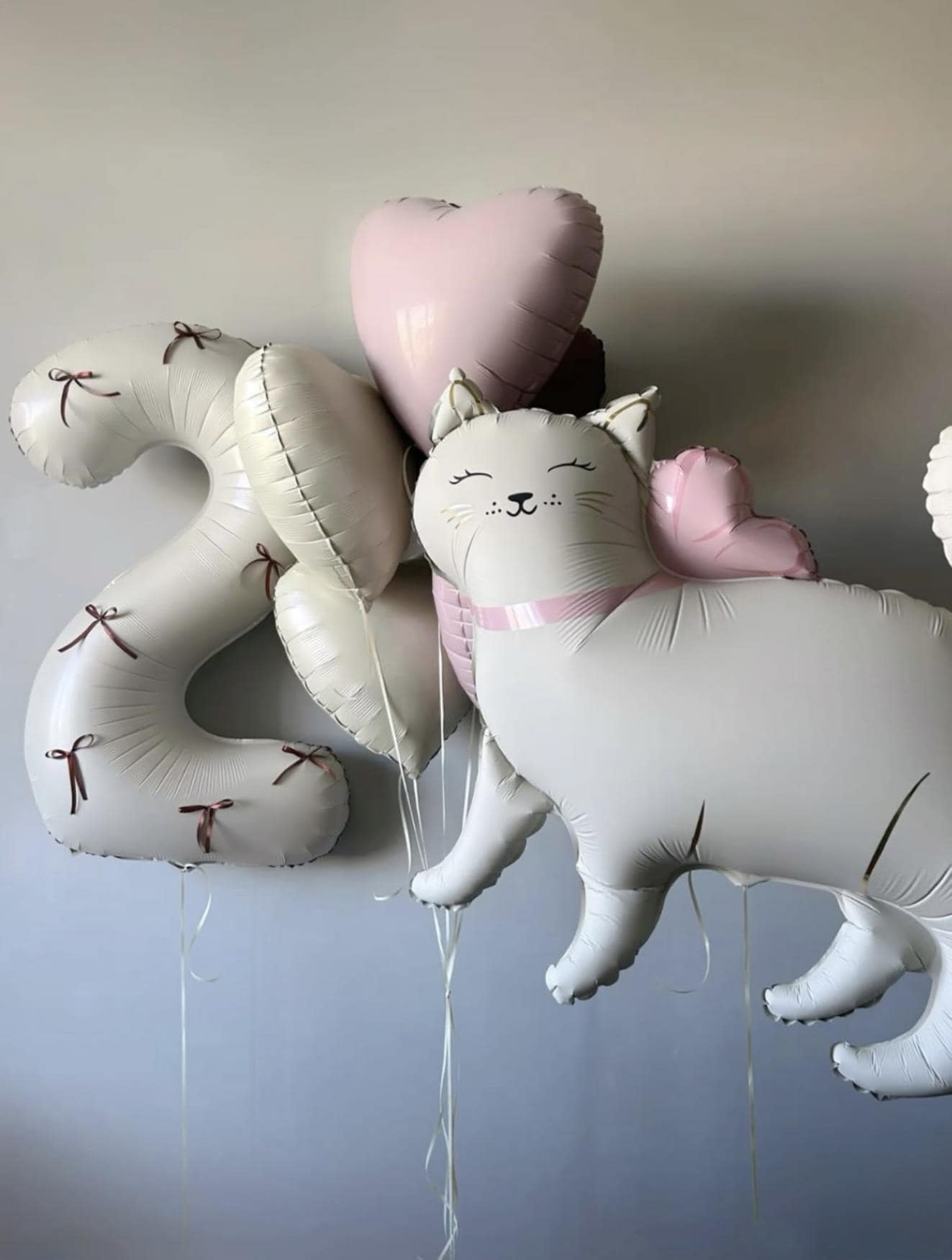 Склад: цифра, фігурка у вигляді котика з бантиком, 4 фольговані кулі у формі серця