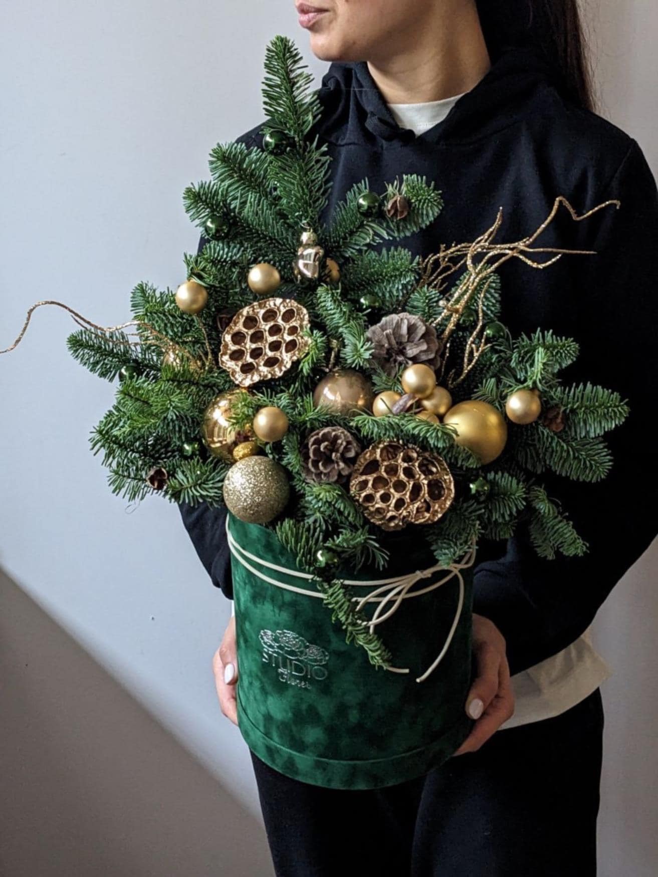 1. Букет «Сяйво казки» прикрашений ялинковими іграшками, шишками, жолудями і золотистими гілками з листям. Оксамитова капелюшна коробка благородного смарагдового відтінку є відмінним місцем для компонування гілок. Крім візуального задоволення, ви відчуєте ніжний, хвойний аромат, який буде створювати особливу атмосферу з тонким сприйняттям лісу.