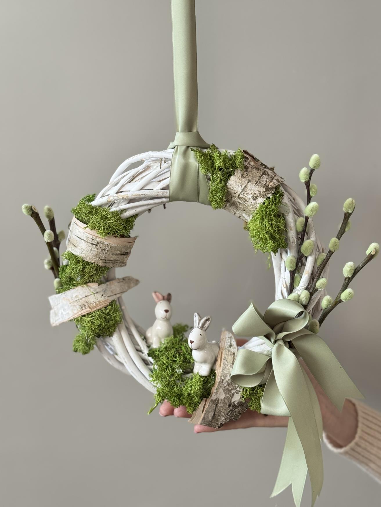 Чудова традиція передбачає розміщення на ньому символів Воскресіння Христового. До виробу прикріплено яйце і зроблені 2 акуратних гніздечка. Замовити вінок-букет пропонуємо за кілька днів до свята, щоб гарантовано отримати його перед Великоднем.